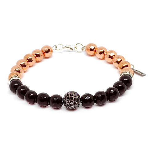Figyelem! Nem szakad, nem nyúlik! Tartós ékszer. Az ékszer ásványai és tartozékai: – 8 mm-es fazettált rózsa Hematit ásványok – 8 mm-es fazettált fekete Jade ásványok – 10 mm-es fekete köves pavé charm – Színtelen köves