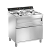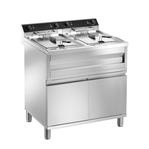Kiemelhető fejegység, főkapcsoló, üzemi visszajelző lámpa, hőfokszabályzó, 2 db műanyag nyelű kosár, kosár akasztó, olajleeresztő csap, ajtós alépítmény. Teljesítmény: 9+9 kW/400V-3N~. Kosár mérete: 210x280x120 mm. Mérete: 800x700x960 mm.