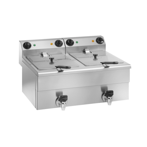 Kiemelhető fejegység, főkapcsoló,üzemi visszajelző lámpa, hőfokszabályzó,2 db műanyag nyelű kosár, kosár akasztó, olajleeresztő csap. Teljesítmény: 3,5+3,5 kW/230V-1N~ Kosár mérete: 220x250x100 mm Mérete: 600x480x250 mm