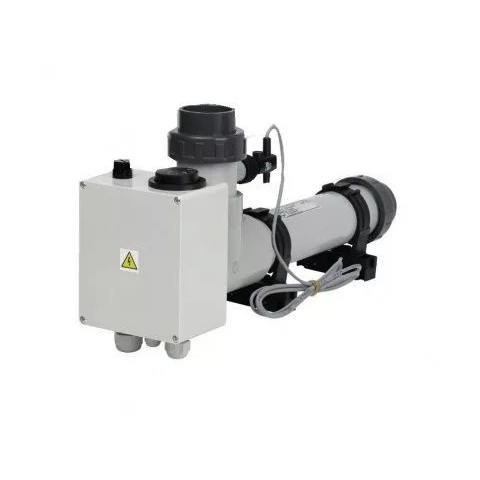 Elektromos fűtőberendezés. Kül és beltéri medencékhez egyaránt használható medencefűtés. Fűtőpatron anyaga: Hőálló műanyag Fűtőbetét anyaga: Titán 20 m³-es medencéhez ajánlott Teljesítménye 6 kW Hőmérséklet szabályozóval, Túlfűtés elleni védelemme