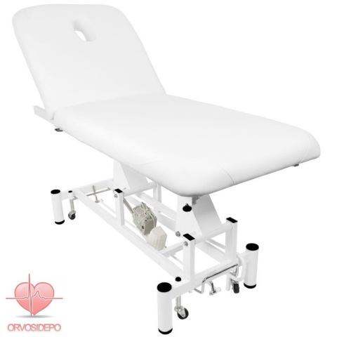1 motoros elektromos masszázságy, fehér műbőrrel kárpitozva, lehajtható görgőkkel szerelve. A magassága elektromosan állítható, a háttámla mechanikusan állítható. Fejtámlájában arckivágás található, melyet egy kivehető párnával takarhatunk. A vissza húzha