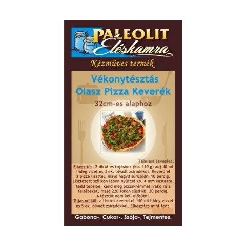 Paleolit Éléskamra Vékonytésztás Olasz pizza lisztkeverék 180g Hagyományos pizza nem hagyományos alapanyagokból. Igazi pizza élmény a saját sütőnkből, búzaliszt nélkül, mégis teljes értékű kulináris élvezet. Tojásmentes recepttel is elkészíthető. CSÖKKEN