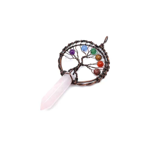 Életfa bronz drót csúcs rózsakvarc medál 5x9cm