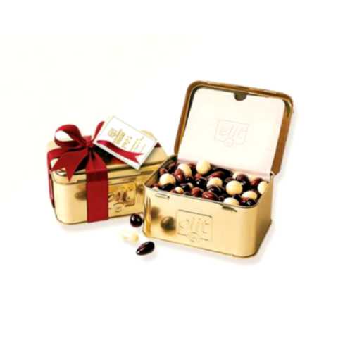 Gyümölcsös és mogyorós ét-, tej- és fehércsokoládé drazsék aranyszínű fémdobozban.