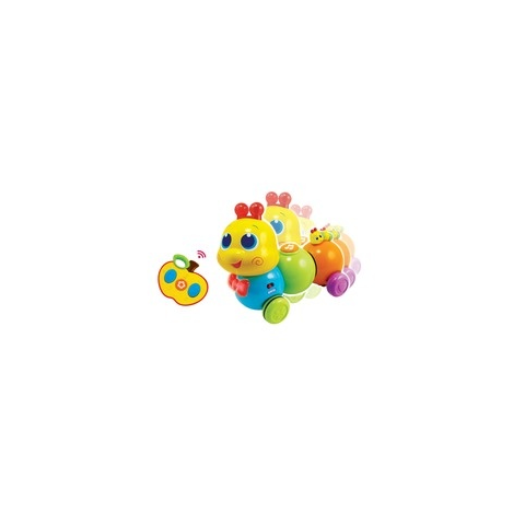 Araszolgató kukac figura, akit távirányítóval mozgathatsz! Az Első távirányítós hernyóm egy műanyagból készült színes kukac, aki mozgás közben még zenélni is tud! A kukac kedves arca és széles mosolya hangos kacagásra ingerli a babát, miközben kúszik-mászik a kis hernyó, a nyakkendője világít, és a játék különféle dallamokkal szórakoztatja a gyereket. A kukac hátán lévő gombbal indul a zene, a hernyót az alma formájú távirányítóval lehet mozgatni.