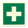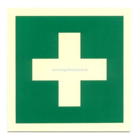 Elsősegély doboz helyét jelölő négyzet alakú matrica, 15x15 cm méretben.
