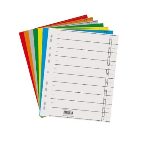 Q-CONNECT Színes, 10 részes, feliratozott, vonalazott elválasztólap újrahasznosított, 230 grammos karton alapanyagból. Mérete: 240 x 300 mm. A/4-es iratokhoz. 11 lefűzőlyukkal. 100 db/csomag.