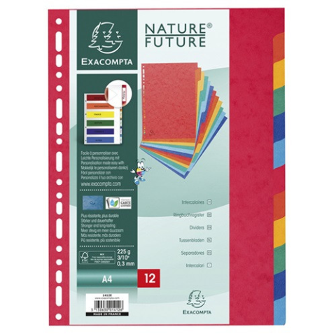 Elválasztólap karton Exacompta A/4 12 részes színes 225 g Méret: A/4Kiváló minőségű színes karton elválasztólapokAlapanyag: 225gr-os kartonNyomtatható előlapFSC minősítéssel rendelkező termékKiválóan alkalmas az iratok rendszerezésére12 részes