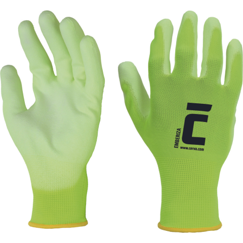 EMBERIZA kesztyű HV sárga 11 • varrat nélküli kötött poliészter kesztyű PU-ba mártva • légáteresztő, kiváló tapintás és fogásbiztonság száraz körülmények között • tűfinomság: 13 gg