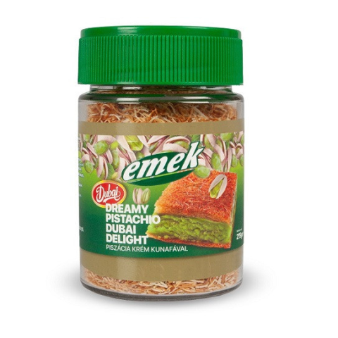 Emek Dubai Cocoa Dreamy Pistachio Dubai Delight pisztáciakrém kadayif tésztával. töltőtömeg: 275g Összetevők: cukor, növényi olaj (pálma, napraforgó), pisztácia (14%), kunafa (10%), tejsavópor, emulgeálószer (napraforgó lecitin E322), színezék, (E16