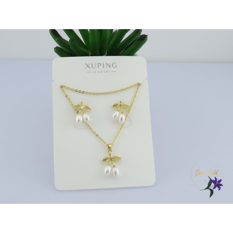 Goldfilled kifinomult elegáns szett nyaklánc fülbevalóMedál és a fülbevaló egy leveles csüngő gyümölcshöz hasonlít , melyet egy kis gyöngy diszít Bármilyen alkalomra viselheted. Szin: 14K Méret: 51 cm de 46 cm re is állítható Medál: