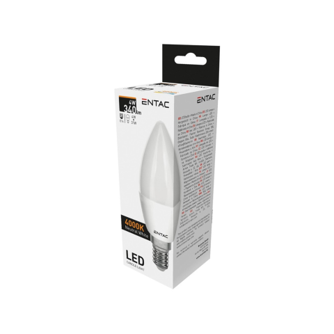 Az Entac Gyertya izzók a hagyományos, gyertya izzókat helyettesítő magas hatékonyságú LED-ek, E14es foglalattal. Elérhetők három színhőmérsékletben, 3000K meleg fényű, 4000K természetes fényű és 6400K hidegfényű változatokban, 4 és 6,5 W teljesítményben.