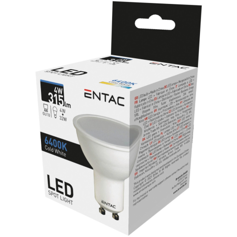 Entac LED Spot Wide Angle GU10 4W CW 6400K Az Entac izzók a hagyományos, izzókat helyettesítő magas hatékonyságú LED-ek. Elérhetők három színhőmérsékletben, 3000K meleg fényű, 4000K természetes fényű és 6400K hidegfényű változatokban. Alacsony fogyaszt