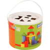 Alkoss csodás építményeket színes fa építőkockákkal! Az Építőkocka formaválogató hengerben 30 darabos készlet piros, sárga, zöld és kék színű építőelemeket tartalmaz, amikből épületeket, járgányokat tudsz összeállítani. A játék különlegessége, hogy a tároló vödör tetején formaválogató rostát találsz, így az elpakolás is fejleszti a kézügyességedet! Az Építőkocka formaválogató henge