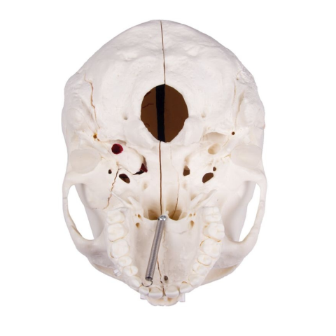 Az emberi koponyamodell koponya- és arcrészre osztott. Összesen 14 különálló darabból áll. Az agyi részt a nyakszirtcsont és az ékcsont, a halántékcsont, a fal