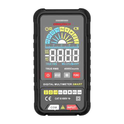 Az Ermenrich Zing TC17 digitális multiméter egy pontos (True RMS) és kompakt mérőeszköz szakemberek és ezermesterek számára. Alkalmas lakások, vidéki házak, ipari létesítmények, irodák és autók elektromos hálózatainak diagnosztikájára, valamint elektromos eszközök hibaelhárítására. A multiméter elfér a zsebében, így nagyobb területen végzett munka esetén is kényelmesen magával viheti. A színes képernyő megjeleníti a mért értékeket, illetve grafikus sk