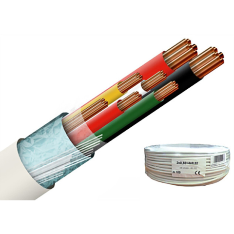 Rézeres, erősített biztonságtechnikai kábel, 2 db vastag és 12 db vékony ér A kábel főbb jellemzői 2 vastag + 4 vékony szigetelt, különböző színű, sodrott réz ér. Vastag erek névleges érkeresztmetszete: 0.5 mm2. Vékony erek névleges érkeresztmetszete: 0.22 mm2. Tömör árnyékolás. Alufólia belső borítás. Fehér PVC külső köpeny. 100 méter / tekercs.