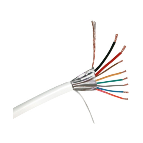Rézeres, erősített biztonságtechnikai kábel, 2 db vastag és 12 db vékony, sodrott ér A kábel főbb jellemzői 2 vastag + 6 vékony eres (erősített) biztonságtechnikai kábel. Rézzel bevont alumínium, sodrott, belső erek (CCA). Belső erek: 16 x 0.20 mm (0.5 mm2) + 7 x 0.20 mm (0.22 mm2). HDPE érszigetelés. Fehér színű PVC köpeny. Alufólia árnyékolás. Külső átmérő: 5.2 mm. 100 m / tekercs kiszerelés, fóliázva.