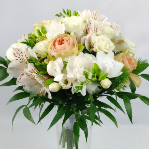 Tiszta Elegancia Menyasszonyi Csokor Összetétel: Fehér Frézia (teljesen nyílt és bimbós formában) Fehér Lisianthus (Török Rózsa) Barack/Halványrózsaszín Angol Rózsa (vagy hasonló, teltfejű kerti rózsa) Fehér/Krém Alstroemeria (Perui Liliom, pirosas csí