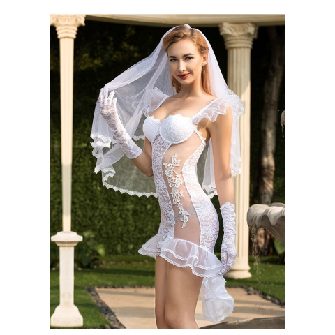 Esküvőiruha jelmez.Csipkés szexi fehér menyasszony jelmez.Fátyol-2hullámcsattal rögzíthető(van a csomagban csatt).Hosszú csipkés kesztyű.Csipkés tanga bugyi.