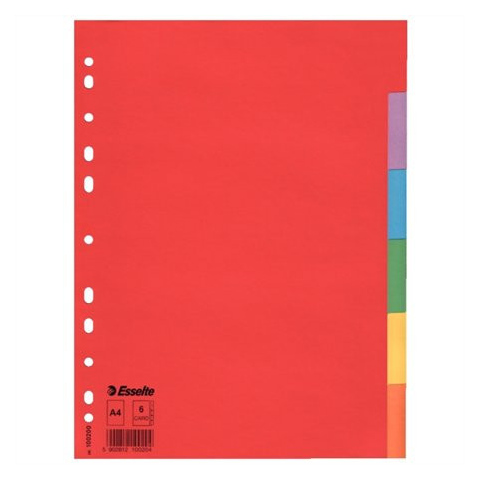 Regiszter, karton, A4, 6 részes, ESSELTE Economy, színes - tartós elválasztólap élénk színkombinációkban - 6 színes fül a könnyű rendszerezéshez - hagyományos, 11-lyukú lefűzőrész - Blue Angel minősített, újrahasznosított karton alapanyag - erős, 160