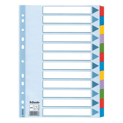 Regiszter, laminált karton, A4, 12 részes, ESSELTE Mylar - különleges, karton alapanyagú termék, melynek vidám, színes regiszter része laminált - praktikus, valamint rendszeres használat során is időtálló - 11 lefűzőlyukkal rendelkezik - méret: A4 -