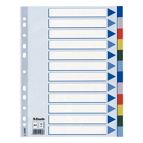 Regiszter, műanyag, A4, 12 részes, ESSELTE - elválasztólap visszafogott színkombinációkban - nagyméretű téglalapok az előlapon a tartalom feltüntetésére - 12 színes fül a könnyű rendszerezéshez - megerősített lefűzőrész az előlapon - hagyományos, 11-