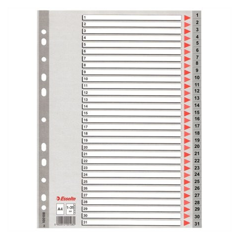 Regiszter, műanyag, A4, 1-31, ESSELTE, szürke - szürke színű regiszter - nagyméretű téglalapok az előlapon a tartalom feltüntetésére - 1-31 felirattal rendelkező regiszter fülek a dokumentumok gyors eléréséhez - megerősített lefűzőrész az előlapon - ha