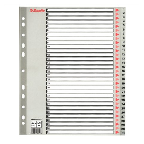 Regiszter, műanyag, A4 Maxi, 1-31, ESSELTE, szürke - szürke színű regiszter - nagyméretű téglalapok az előlapon a tartalom feltüntetésére - megerősített lefűzőrész az előlapon - hagyományos, 11-lyukú lefűzőrész - 0,12 mm vastag PP alapanyag - az A4+ mé