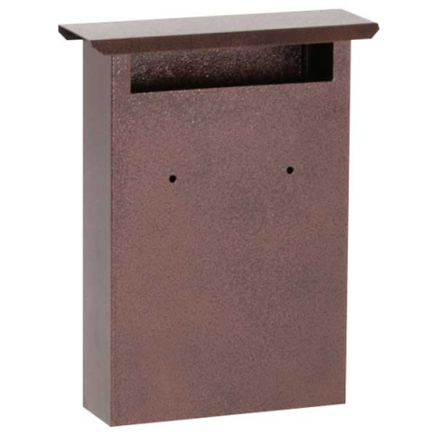 • kapun, kerítésen belülre szerelhető• anyaga kezeletlen acéllemez• műanyag porszórással színezett• hátsó bedobónyílás esővédő nélkül• felfelé nyíló ajtó• betekintő nyílással• cilinderzár nélkül