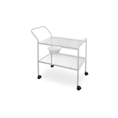 Eszközkocsi üveg polcokkal , műanyag tállal Bemutató termünkben kipróbálható! Megnevezés: kezelő kocsi, műszertartó, eszköztartó, eszköz kocsi eszközkocsi üveg polcokkal , műanyag tállal - por szórt fehér festékkel kezelt fémváz - 2 üvegpolc - egy