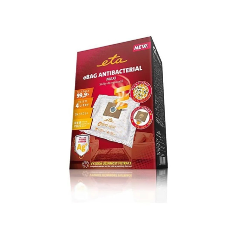 Az ETA eBag Antibacterial Maxi porzsák ideális választás allergiások és háziállat-tulajdonosok számára. Speciális antibakteriális rétege és aktív szén tartalma gondoskodik a higiénikus környezetről és a kellemetlen szagok semlegesítéséről.