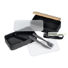 BPA mentes polipropilénből készült uzsonnás doboz szett, bambusz tetővel. A készlet két különálló dobozból, egy elválasztóból, az alsó fedélben lévő evőeszközökből (kés, villa és kanál) és a készletet lezáró gumiszalagból áll. Méret: 18,6 × 10,6 × 9,8 cm