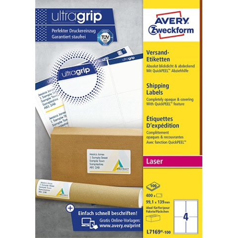 Etikett címke Avery 99,1x139 mm nagyfedőképességű fehér Avery Zweckform nagyfedőképességű etikett címke L7169-100 tökéletes csomagok és küldemények felcímzéséhez problémamentes nyomtatás 400 db FSC® minősített cí