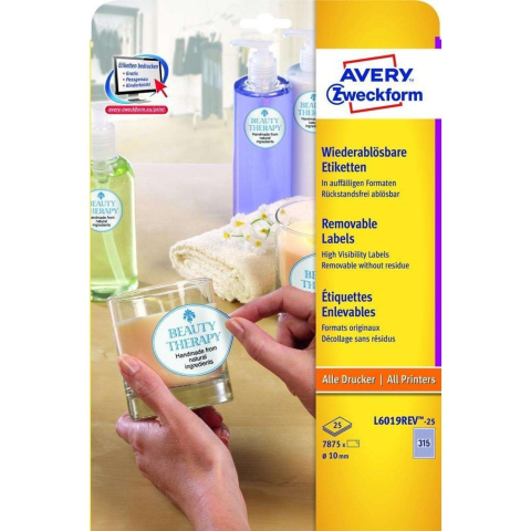 Etikett címke, o10mm, visszaszedhető, 315 címke/ív, 25 ív/doboz, Avery fehér