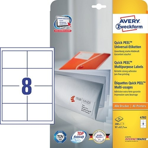 AVERY-ZWECKFORM Garantáltan elakadásmentes nyomtatás, elakadásmentes nyomtatás a lézernyomtatókban a TÜV Süd által tesztelve, a QuickPEEL™ technológiának köszönhetően a címkék gyorsabban és könnyebben eltávolíthatóak a hordozóról, minden ismert nyomtat