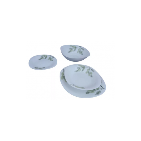 Étkészlet 19 részes szögletes Zöld levél minta 222002 - E legáns kialakítás - Szín: fehér alapon zöld levél minta - Mosogatógépben mosható - Mikrohullámú sütõben használhat ó - Tartalma: 6 db mélytányér, 6 db lapostányér, 6 db csemegetányér, 1 db levestál
