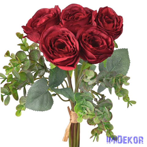 Eukaliptuszos rózsa selyemvirág csokor 36cm - Bordó dekorációs kellék árgrafikon