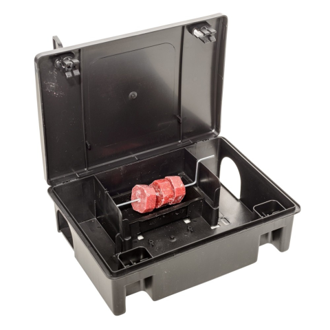 Mérete: 29,4 × 21,6 × 9,6 cm. Kül- és beltéren egyaránt használható, nagy teherbírású, időjárásálló. Fekete tetővel kapható, kulccsal zárható, biztonságos. Fém paraffinos kockatartóval szállítjuk, méreg vagy ragacslap behelyezésével is alkalmazható. Méret
