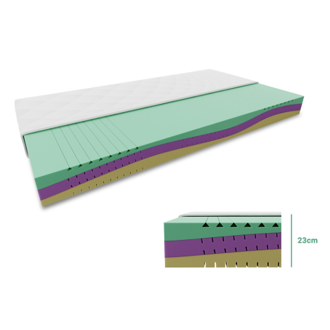 EUREBIA 23 cm habmatrac a komfort, gerinctámogatás és természetes módon a test formájához alkalmazkodó támasz jegyében tervezett matrac. A magas minőségű habokból és a mag könnyű hajlításából álló háromrétegű kialakítás tökéletesen reagál a terhelésre, és segíti a testet az egészséges alvási pozíció megtartásában. A 23 cm-es magasság nemcsak fekvés közbeni, hanem felkeléskori kényelmet is biztosít – ideális mindennapi használatra, valamint igén