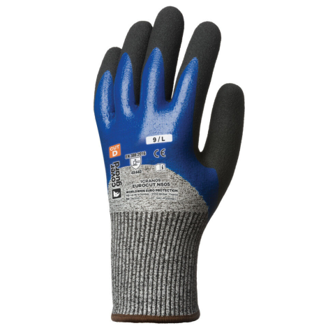 EUROCUT 5 VÁGÁSBIZTOS, 3/4 HÁT KÉK NITRIL + CSB RÉTEG_11 * 13-as kötésű, szürke, varrásmentes, vágásbiztos, HPPE, polianid és elasztán alapanyagú védőkesztyű * ökölcsontig kék sima nitril mártás + a tenyerén fekete speciális Sandy csúszásbiztos nitri