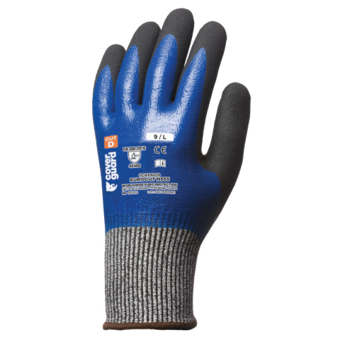 EUROCUT 5 VÁGÁSBIZTOS, VÉGIG KÉK NITRIL + SANDY CSB RÉTEG_10 Pettyezett, szürke,13-mas kötésű varrásnélküli kesztyű. HPPE-vel, ásványi szálakkal, poliamiddal és elasztánnal erősítve. Duplán mártott nitril tenyér: egy réteg sima kék, egy érdesített feke