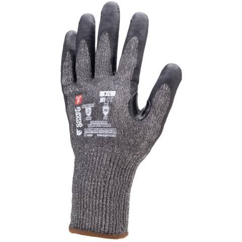 EUROCUT N600 FEK. TENY. MIKROHAB.NITR. VB. KESZTYŰ_08 Fekete HDPE-vel, poliamiddal és elasztánnal erősített 13-mas kötésű kesztyű fekete nitril habbal mártott tenyérrel.Nitrillel megerősített hajlat a hüvelyk és mutatóujj között.Kötött mandzsetta.