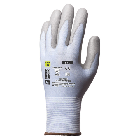 EUROCUT P318 VÉKONY VÁG.BIZT. V.KESZTYŰ PU TENYÉRREL_09 Világoskék HPPE-vel, poliamiddal és elasztánnal erősített, 18-as kötésű kesztyű. Szürke PU-val mártott tenyér Kötött mandzsetta