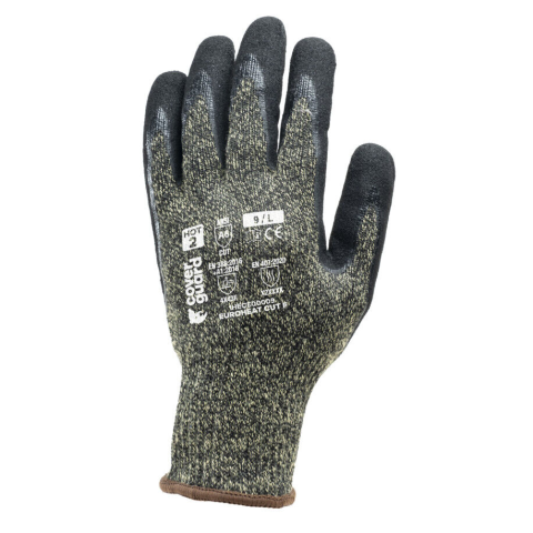 EUROHEAT TDM F, HOT 2 FEKETE DUPLA NITRIL HULLÁM PETTY_7 EUROHEAT CUT F 10-es kötésű, varrás nélküli sárga és fekete foltos kötött védőkesztyű, poli-pamut és aramid alapanyagból. Dupla rétegű mártás a tenyéren: sima nitril és sandy csúszásbiztos felüle