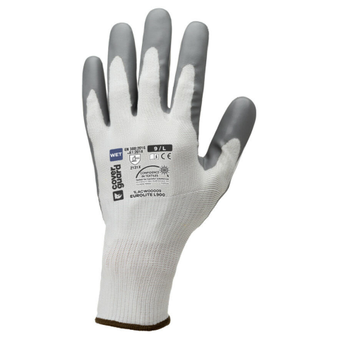 EUROLITE L900 FEHÉR/SZÜRKE LATEX KÖRNYEZETBARÁT KESZTYŰ_11 EUROLITE L900 újrahasznosított poliészter (85%) és elasztán (15%) alapanyagú, 13-as kötésű kesztyű, szürke, gyémánt mintázatú dombornyomott latex bevonattalKötött mandzsetta2-es színtű kontakt