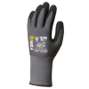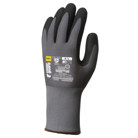 EUROLITE TENYERÉN FEKETE MIKROHABOSÍTOTT NITRIL_10 Szürke, varrás nélküli, poliamidal erősített, 15-ös kötésű kesztyű, fekete nitril habbal mártott tenyérrel és kötött mandzsettával OEKO-TEX® STANDARD 100 minősítés, CQ 1301/1, IFTH vagy 15.HCN.70502, H