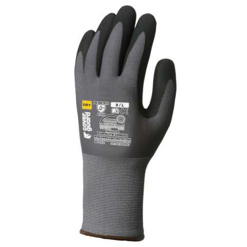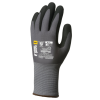 EUROLITE TENYERÉN FEKETE MIKROHABOSÍTOTT NITRIL_6 Szürke, varrás nélküli, poliamidal erősített, 15-ös kötésű kesztyű, fekete nitril habbal mártott tenyérrel és kötött mandzsettával OEKO-TEX® STANDARD 100 minősítés, CQ 1301/1, IFTH vagy 15.HCN.70502, HO