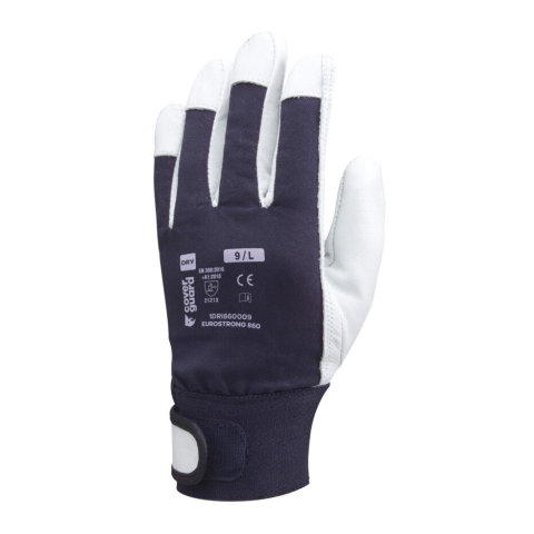 EUROSTRONG 860 SZÍNKECSKEBŐR, KÉK DZSÖRZÉ KÉZHÁTTAL_10 * erezett színkecskebőr sofőrkesztyű * hüvelykujj és körömvédő * kék pamutvászon kézhát * elasztikus mandzsetta, állítható tépőzáras szegéllyel