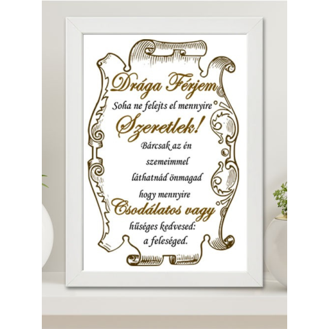 Évfordulóra nagy falikép, drága férjem. Ha neked van a legcsodálatosabb férjed, lepd meg őt házassági évfordulótokon, születésnapjára vagy karácsonykor és mondd el neki egy nagy faliképpel mennyit is jelent ő neked. A képkeret és a háttér színe fehér, fal